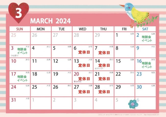 【2024年3月カレンダー】イベントと定休日のお知らせ